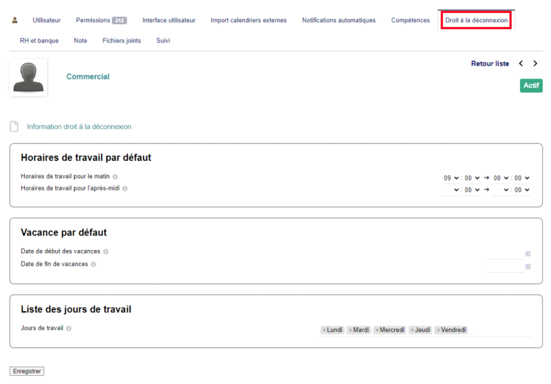 Pour un salarié ayant des horaires différents, vous devrez préciser ses jours de travail, ses horaires, … directement depuis sa fiche utilisateur, onglet « Droit à la déconnexion ».