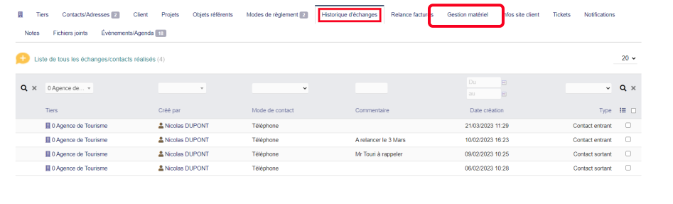 Un historique complet est également accessible (selon les droits) depuis le menu Tiers, puis « Tous les échanges ».